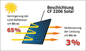 Eine Beschichtung mit CF 2206 ist photokatalytisch aktiv. Bei einer Bestrahlung mit Licht werden an der Moduloberfläche reaktive Sauerstoffspezies gebildet. Der aktivierte Sauerstoff ist in der Lage, alle organischen Schmutzpartikel zu zersetzen, die mit der Oberfläche in Kontakt kommen.