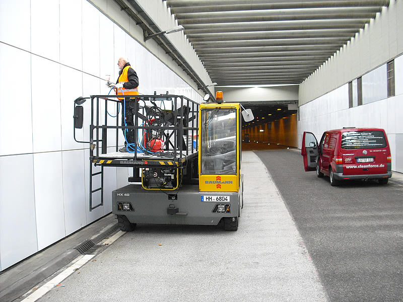 Die Beschichtung im Elbtunnel Hamburg wurde vor 3 Jahren von Cleanforce das erste Mal aufgetragen und verhält sich wie am ersten Tag. Es fahren im Durchschnitt am Tag 120.000 Autos und LKW durch den Elbtunnel. Es sind extremste Verschmutzungen an den Wänden, die fast nur mit Wasser entfernt werden.